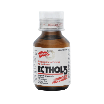 Perros: pulgas, piojos, sarna sarcóptica y garrapatas: en todos los casos disolver 1 medida (10 ml) de ECTHOL-5 en medio litro de agua y con una esponja o rociador, empapar el cuerpo del animal a contrapelo y dejar secar naturalmente. Aplicar sobre mantos secos. Repetir el tratamiento a los 14 días o con la frecuencia que indique el médico veterinario.