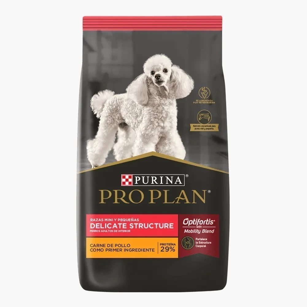 PRO PLAN® Delicate Structure Razas Mini y Pequeñas con OptiFortis® fortalece los huesos y dientes. Además nutre la delicada piel de los perros de raza pequeña.